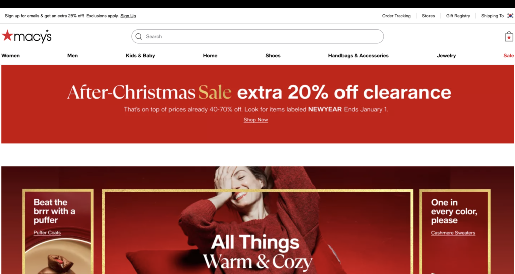 메이시스는 정기적인 할인 행사와 프로모션으로 합리적인 가격에 고급스러운 제품을 구매할 수 있는 기회를 제공하며 블랙 프라이데이, 프레지던트 데이, 연말 세일와 같은 세일 시즌에는 더욱 인기가 높습니다.